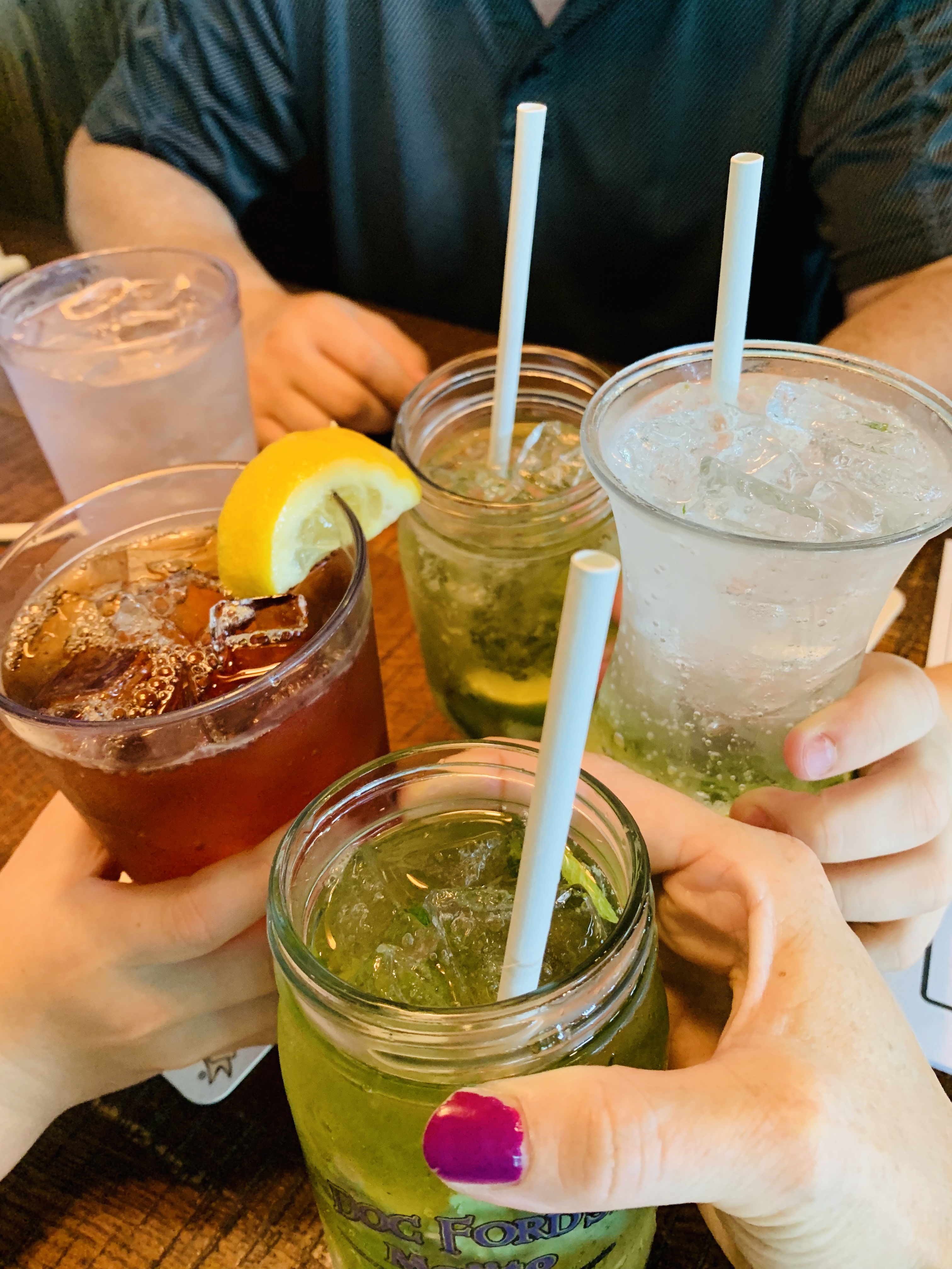 We douchen ons, kleden om en zien de drukte op de parkeerplaats. Mooie tijd om weg te gaan. We tuffen naar ons favo plekje Doc Fords. Wat is dat toch een leuke tent! We krijgen hetzelfde plekje aangewezen als mei 2018. Grappig!