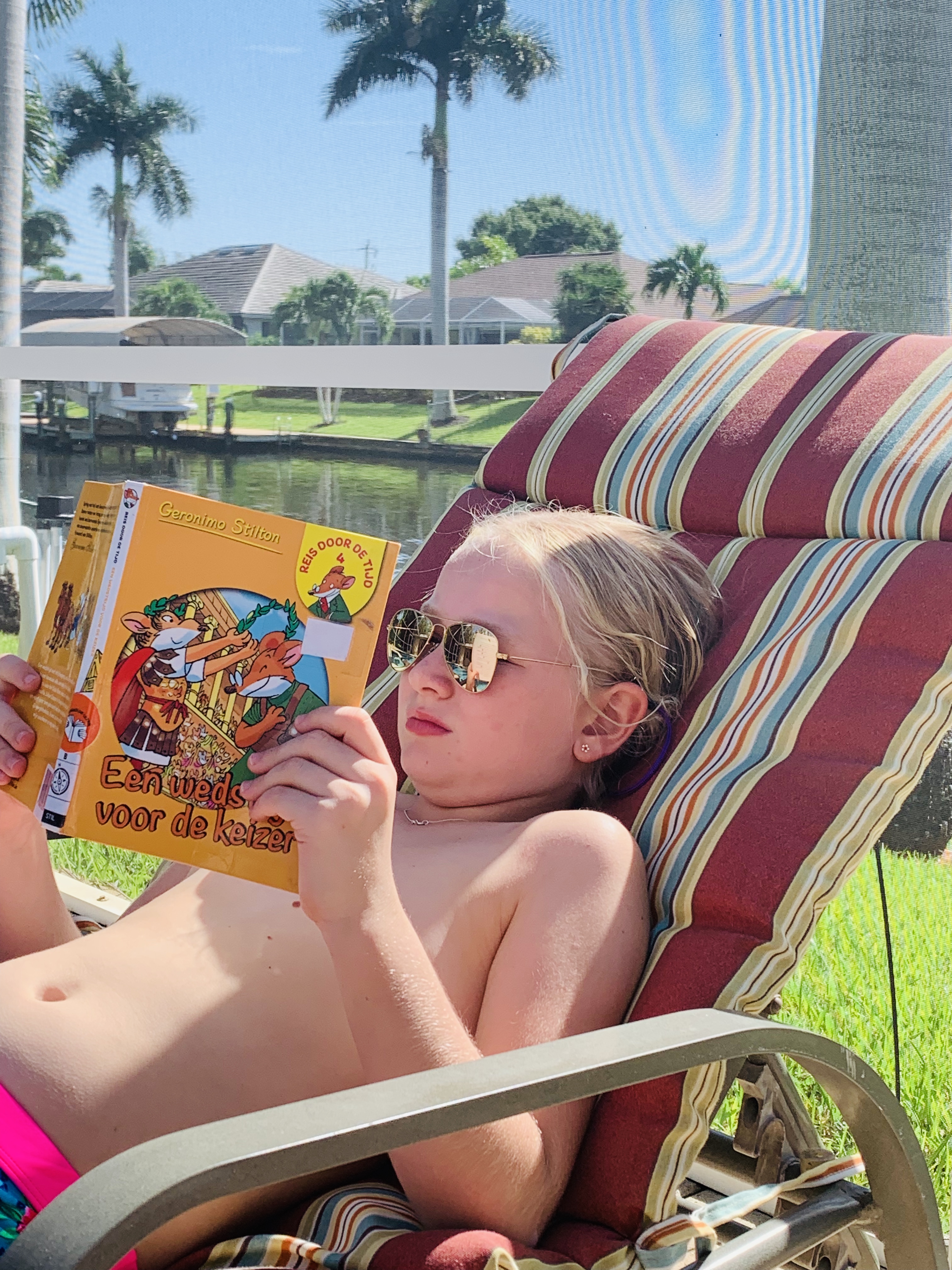 De hele ochtend verloopt een beetje van: liggen, smeren, keren, bakken, braden, afkoelen, drankje, plasje, liggen, chillen, kletsen, lezen en weer smeren en keren. Gewoon niks doen en mén wat ben ik daar goed in. Ben cum laude geslaagd deze ochtend.